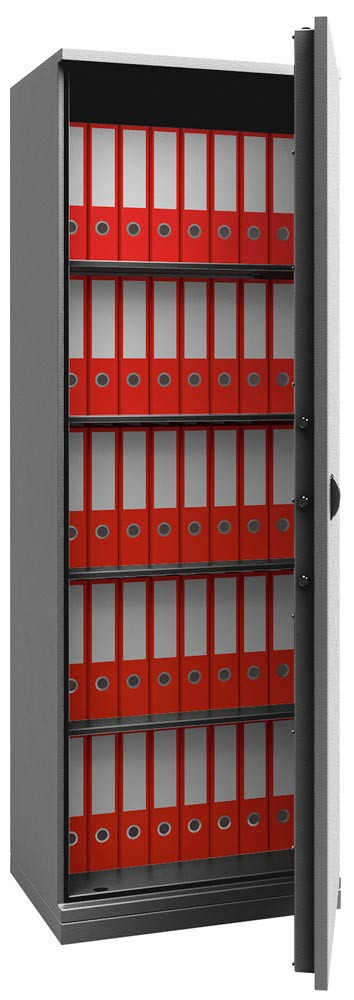Feuergeschützter Büroschrank, BxTxH 670x500x1950 mm, 1 Tür, 4 Böden, Kapazität 40 Ordner, RAL 7024 graphitgrau