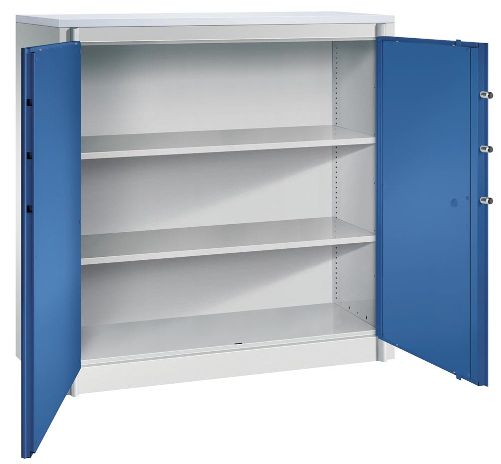 Feuergeschützter Flügeltürenschrank, BxTxH 1200x500x1226 mm, 2-türig, 2 Fachböden, RAL 7035/5010 lichtgrau/enzianblau