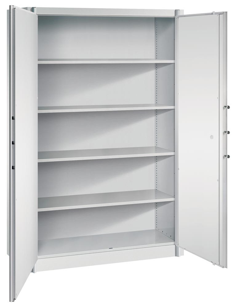 · Allseitig doppelwandig, zwischen den Wandungen 25 mm starke Spezial-Isolierplatten Klasse A1, nicht brennbar nach DIN 4102 · Flügeltüren lagern oben und unten in stabilen Drehbolzen · Links und rechts je 3 Sicherungsbolzen, die in die Seitenwände einrasten · 5-riegeliges Bolzenriegelwerk (seitlich 3 x, oben/unten je 1 x) · Doppelbart-Sicherheitsschloss mit 2 Schlüsseln · Schrankgriffe in schwarz · Traglast pro Einlegeboden ca. 70 kg (bei gleichmäßig verteilter Last) ∙ Halbhohe Schränke mit DBS-Abdeckplatte, lichtgrau
