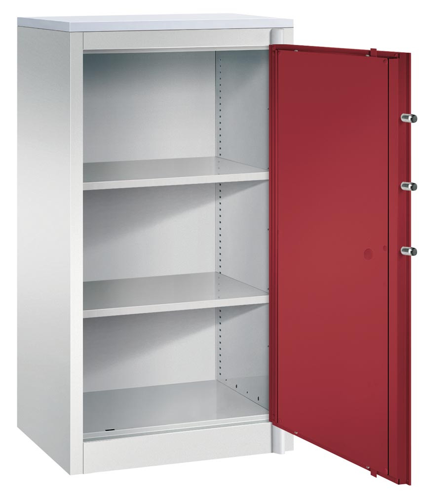 Feuergeschützter Flügeltürenschrank, BxTxH 650x500x1226 mm, 1-türig, 2 Fachböden, RAL 7035/3003 lichtgrau/rubinrot E859372