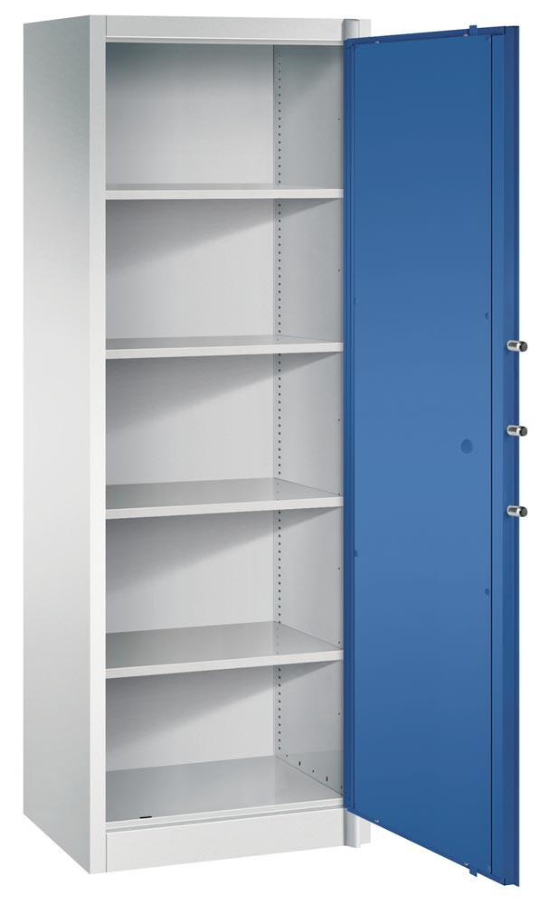 Feuergeschützter Flügeltürenschrank, BxTxH 650x500x1950 mm, 1-türig, 4 Fachböden, RAL 7035/5010 lichtgrau/enzianblau