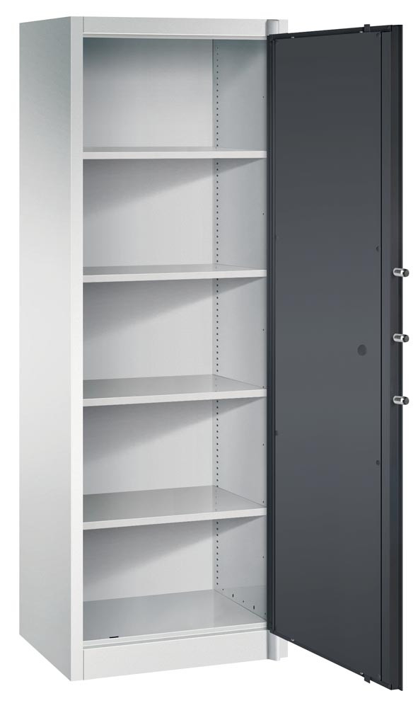Feuergeschützter Flügeltürenschrank, BxTxH 650x500x1950 mm, 1-türig, 4 Fachböden, RAL 7035/7021 lichtgrau/schwarzgrau