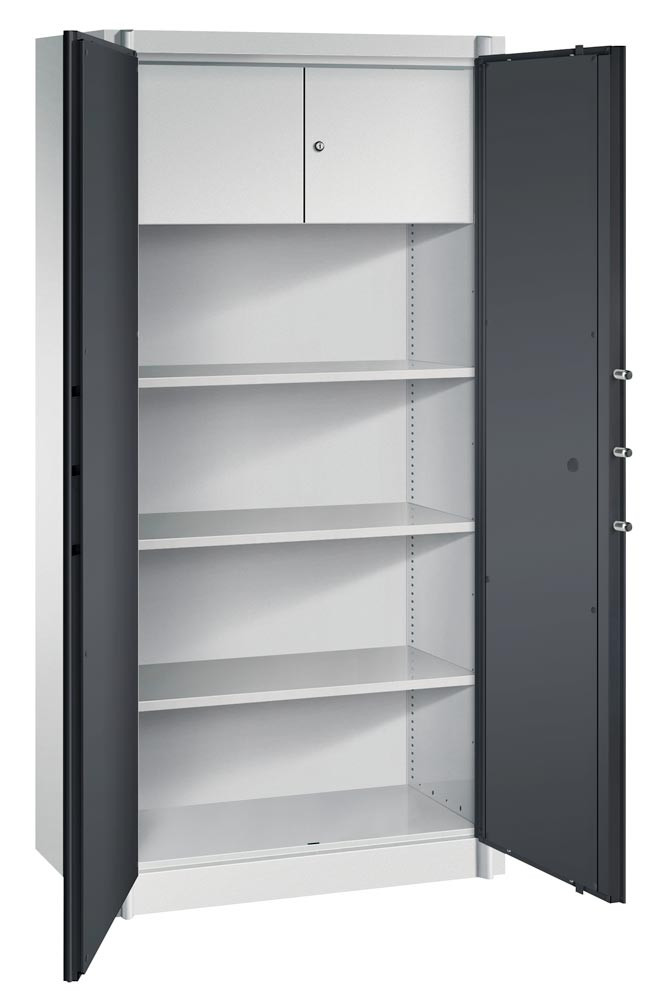 Feuergeschützter Flügeltürenschrank, BxTxH 930x500x1950 mm, 2-türig, 3 Fachböden, 1 Schließfach, RAL 7035/7021 lichtgrau/schwarzgrau