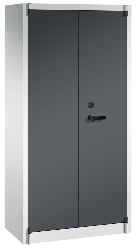 Feuergeschützter Flügeltürenschrank, BxTxH 930x500x1950 mm, 2-türig, 4 Fachböden, RAL 7035/7021 lichtgrau/schwarzgrau E859384