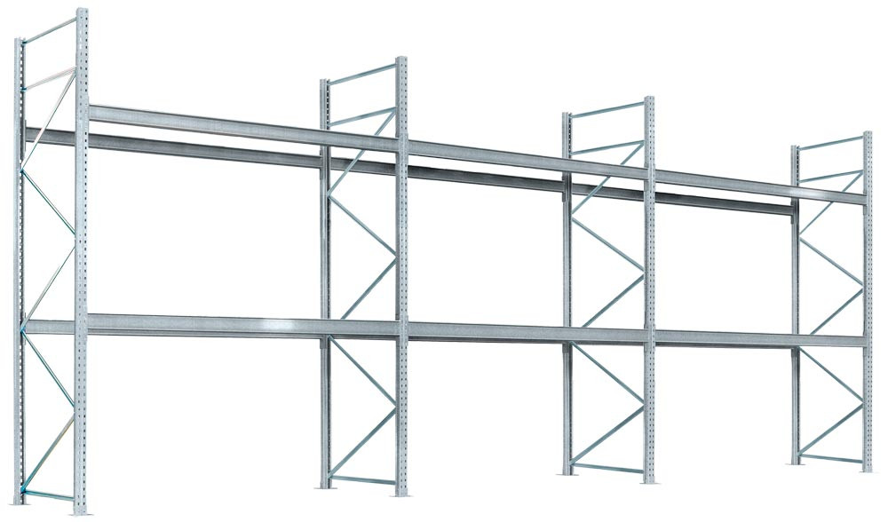 Feuerverzinktes Palettenregal-Set, 3 Felder, 3 Lagerebenen, max. Palettengewicht 1000 kg, Feldlast 6000 kg, BxTxH 8590x1100x4500 mm