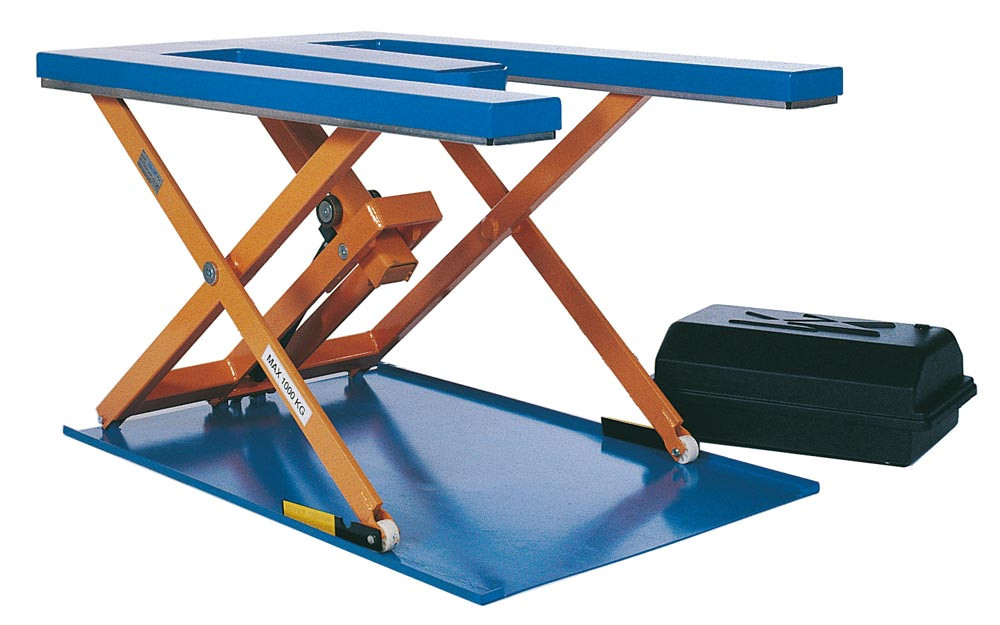 ∙ Patentierter Hebemechanismus ermöglicht extrem geringe Bauhöhe im eingefahrenen Zustand ∙ Keine Grube erforderlich ∙ Per Knopfdruck stufenlos auf die gewünschte, ergonomische Arbeitshöhe einstellbar ∙ Externes Hydraulik-Aggregat in stabilem, leicht zu transportierenden Kunststoffkasten ∙ Verbindung Hydraulik-Aggregat mit dem Tisch erfolgt über eine Schnellkupplung ∙ Bedienelement mit den Funktionen Auf/Ab/Not-Aus mit 3 m Anschlusskabel · Alle Modelle entsprechen der EN-1570-1, haben eine CE-Kennzeichnung und sind mit Sicherheitsleisten und elektrisch gesteuerten Sicherheitsventilen ausgerüstet ∙ Plattform und Rahmen RAL 5002 ultramarineblau, Scheren RAL 2009 signalorange pulverbeschichtet