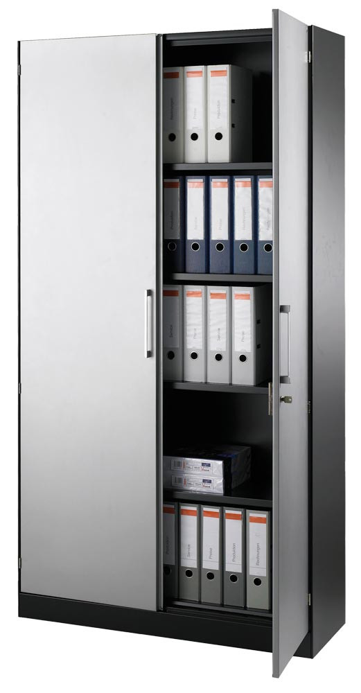 Flügeltürenschrank, BxTxH 800x435x1980 mm, 4 lackierte Fachböden, Korpus RAL 7021, Front RAL 9006