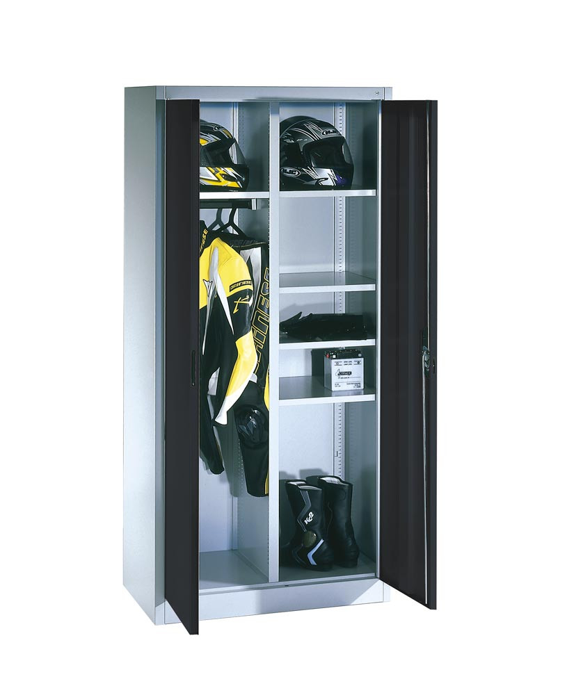 Flügeltürenschrank, BxTxH 930x500x1950 mm, links 1 Hutboden + 1 Kleiderstange, rechts 4 halbe Böden, RAL 7035/7021 lichtgrau/schwarzgrau