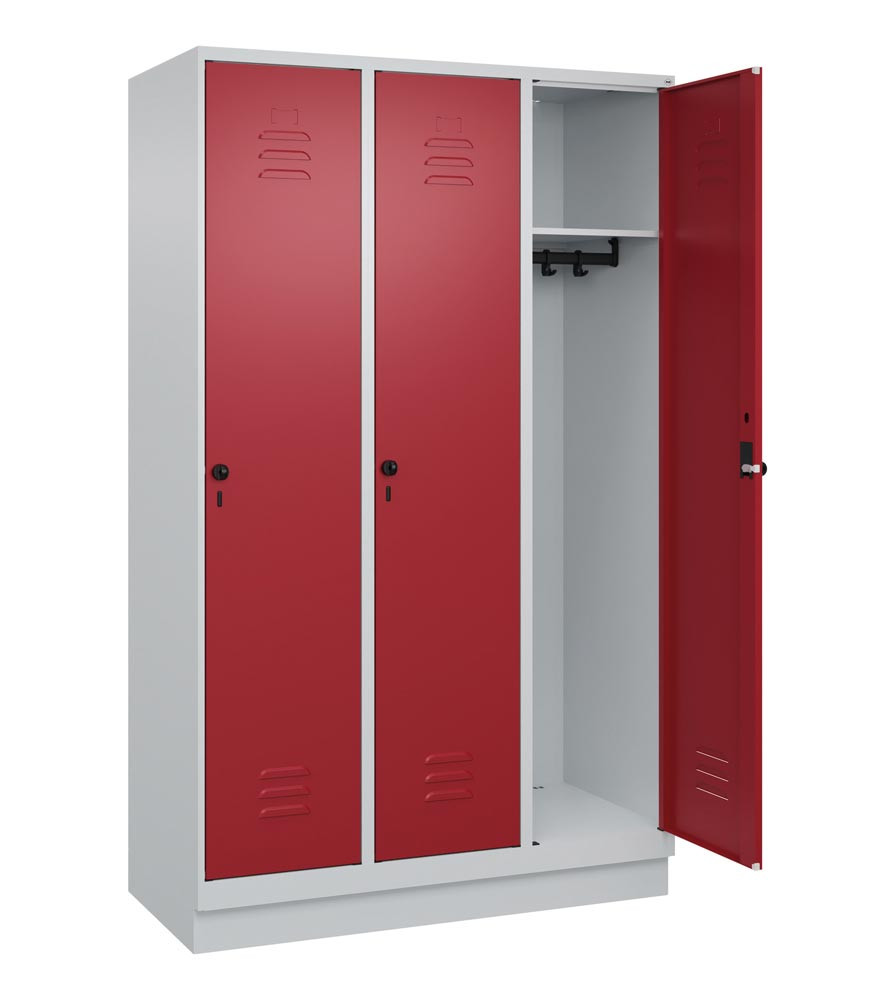 Garderobenschrank, BxTxH 1200x500x1950 mm, 3 Abteile, B 400 mm, Sockel, Drehriegel, Farbwahl