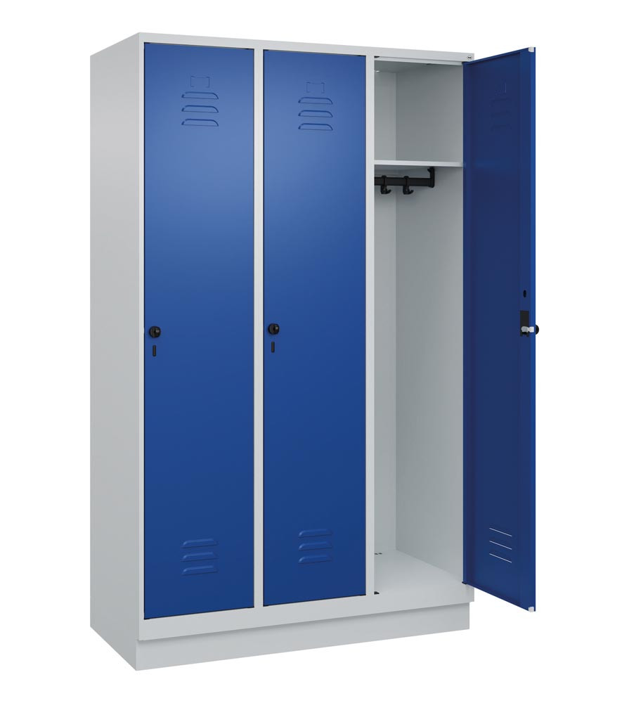 Garderobenschrank, BxTxH 1200x500x1950 mm, 3 Abteile, B 400 mm, Sockel, Drehriegel, RAL 7035/5010