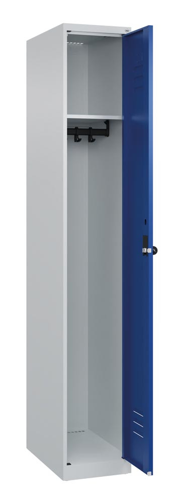 Garderobenschrank, BxTxH 300x500x1850 mm, 1 Abteil, B 300 mm, Bodenstehend, Drehriegel, RAL 7035/5010 E6471444