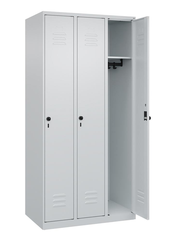 Garderobenschrank, BxTxH 900x500x1850 mm, 3 Abteile, B 300 mm, Bodenstehend, Drehriegel, RAL 7035
