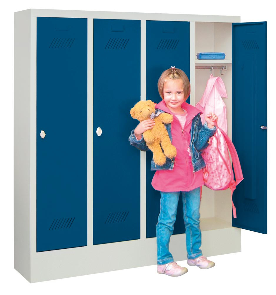 · Ideal für Kindergärten und Schulen zur Entlastung der Kinder in ihrem täglichen Ablauf · Kleidung, Bücher und Taschen können spielend untergebracht werden · Türen mehrfach gekantet zur Vermeidung von Verletzungen · Glatte, leicht zu reinigende Flächen sorgen für eine problemlose Pflege · Belüftungsschlitze in den Türen für eine optimale Belüftung