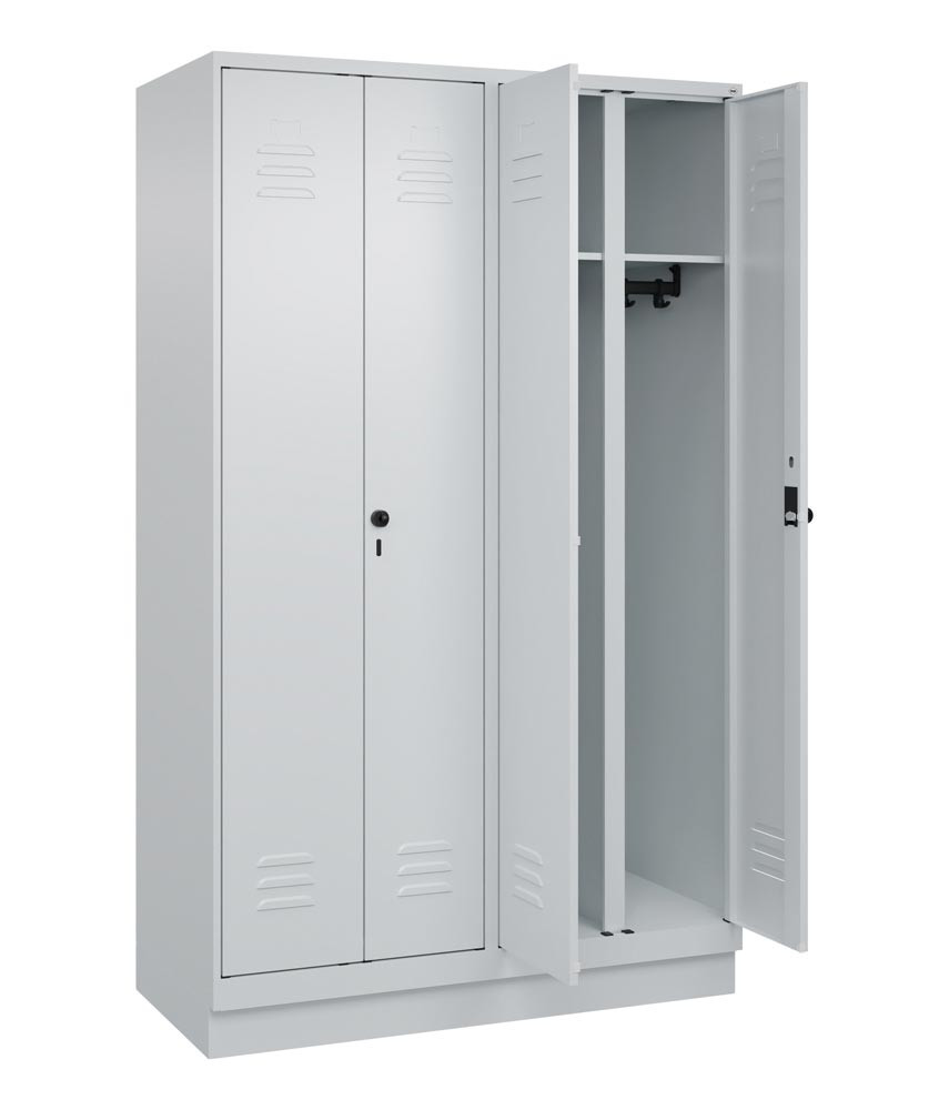 Garderobenschrank, paarw. zuein. schlagende Türen, BxTxH 600x500x1950 mm, 2 Abteile, Abt.B 300 mm, Sockel, Drehriegel, RAL 7035 E6476230