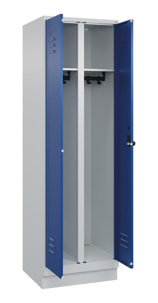 Garderobenschrank, paarw. zuein. schlagende Türen, BxTxH 600x500x1950 mm, 2 Abteile, Abt.B 300 mm, Sockel, Drehriegel, RAL 7035/5010 E6476231