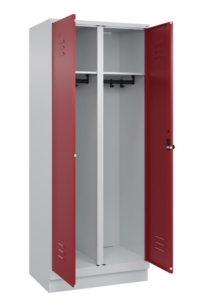 Garderobenschrank, paarw. zuein. schlagende Türen, BxTxH 800x500x1950 mm, 2 Abteile, Abt.B 400 mm, Sockel, Drehriegel, Farbwahl