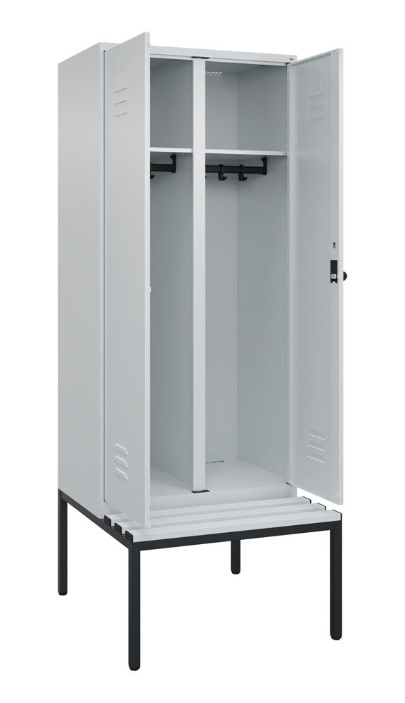 Garderobenschrank, untergeb. Sitzbank, BxTxH 600x500x2120 mm, 2 Abteile, Abt.B 300 mm, Kunststoffleisten, Drehriegel, Farbwahl E6476250