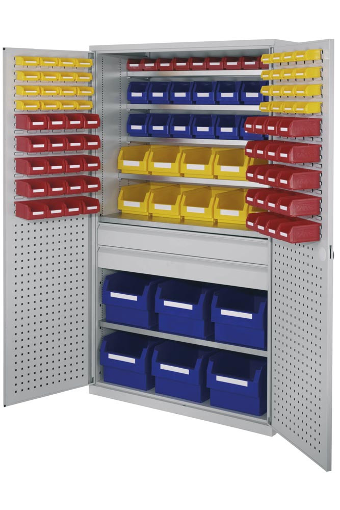 Großraumschrank, Türen mit Lochplatten, Kästen: 6xGr. 1, 10xGr. 4, 14xGr. 6, 10xGr. 7, 2 Schubladen mittig, BxTxH 1130x590x1950 mm
