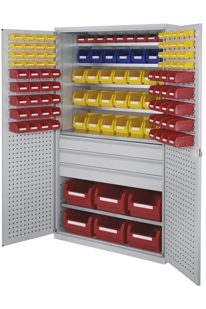 Großraumschrank, Türen mit Lochplatten, Kästen: 6xGr. 2, 21xGr. 5, 7xGr. 6, 10xGr. 7, 3 Schubladen mittig, BxTxH 1130x590x1950 mm