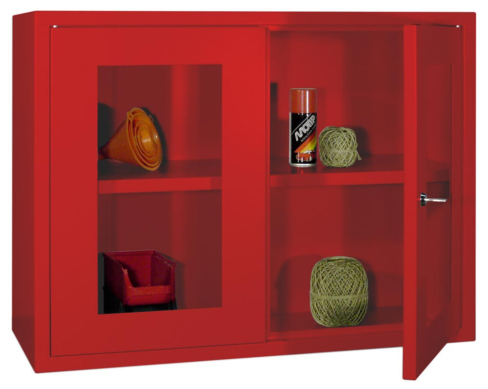 Hängeschrank, 2 Sichtfenstertüren, Rückwand glatt, 1 verstellbarer Boden, Zylinderschloss, BxTxH 800x300x600 mm, RAL 3000