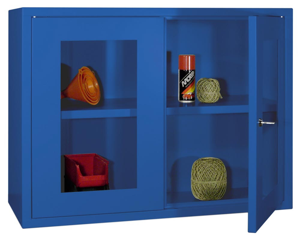 Hängeschrank, 2 Sichtfenstertüren, Rückwand glatt, 1 verstellbarer Boden, Zylinderschloss, BxTxH 800x300x600 mm, RAL 5010