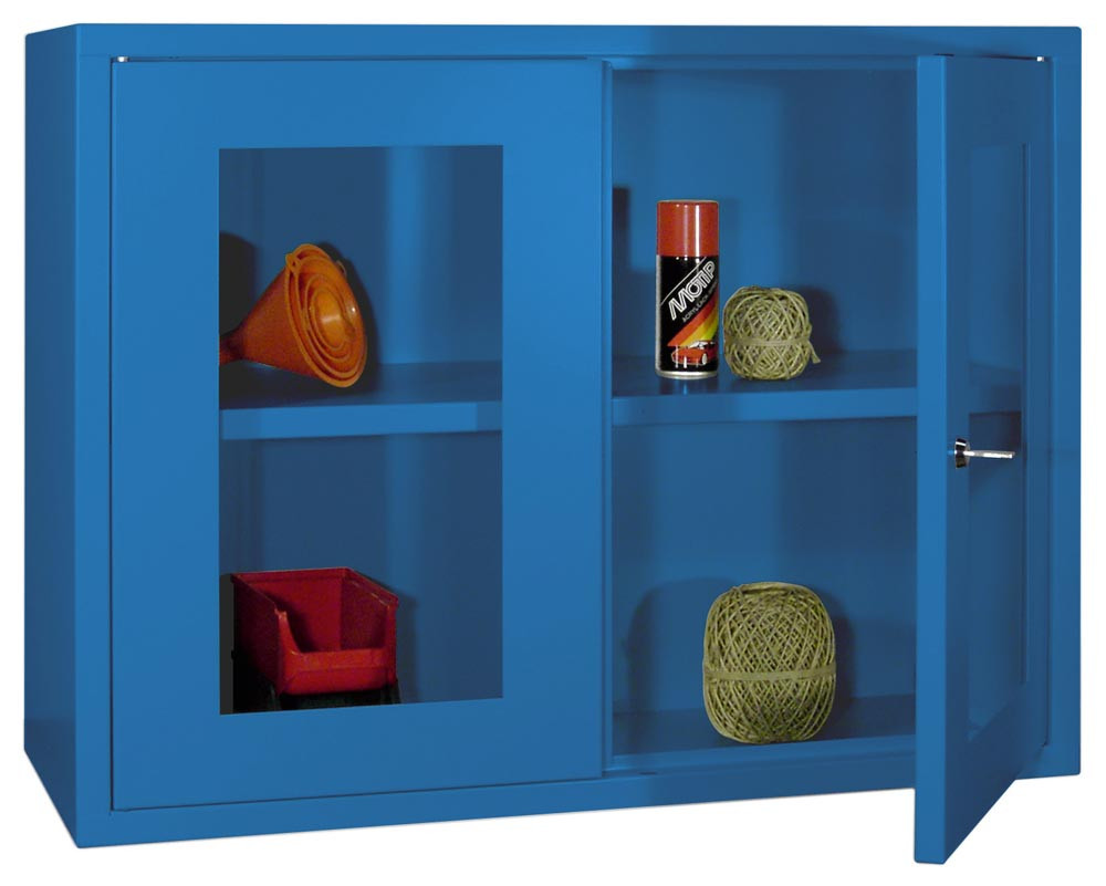 Hängeschrank, 2 Sichtfenstertüren, Rückwand glatt, 1 verstellbarer Boden, Zylinderschloss, BxTxH 800x300x600 mm, RAL 5015