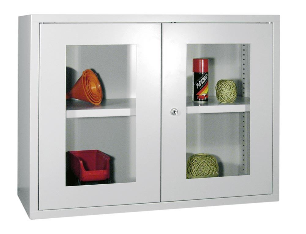 Hängeschrank, 2 Sichtfenstertüren, Rückwand glatt, 1 verstellbarer Boden, Zylinderschloss, BxTxH 800x300x600 mm, RAL 7035