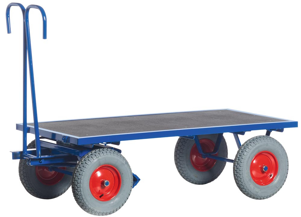 ∙ Schweißkonstruktion aus Profilstahl ∙ RAL 5010 enzianblau pulverbeschichtet ∙ Schlag- und kratzfest ∙ Drehschemellenkung mit Kugelkranz ∙ Scherendeichsel mit Sicherheits-Handgriff ∙ Automatische Rückstellung in Ruheposition ∙ Ladefläche und Wände aus rutsch- und wasserfester Siebdruckplatte ∙ Reifen-Naben mit Rollenlager ∙ Gemäß EN 1757-3 mit automatischer Feststellbremse, auf die Vorderräder wirkend