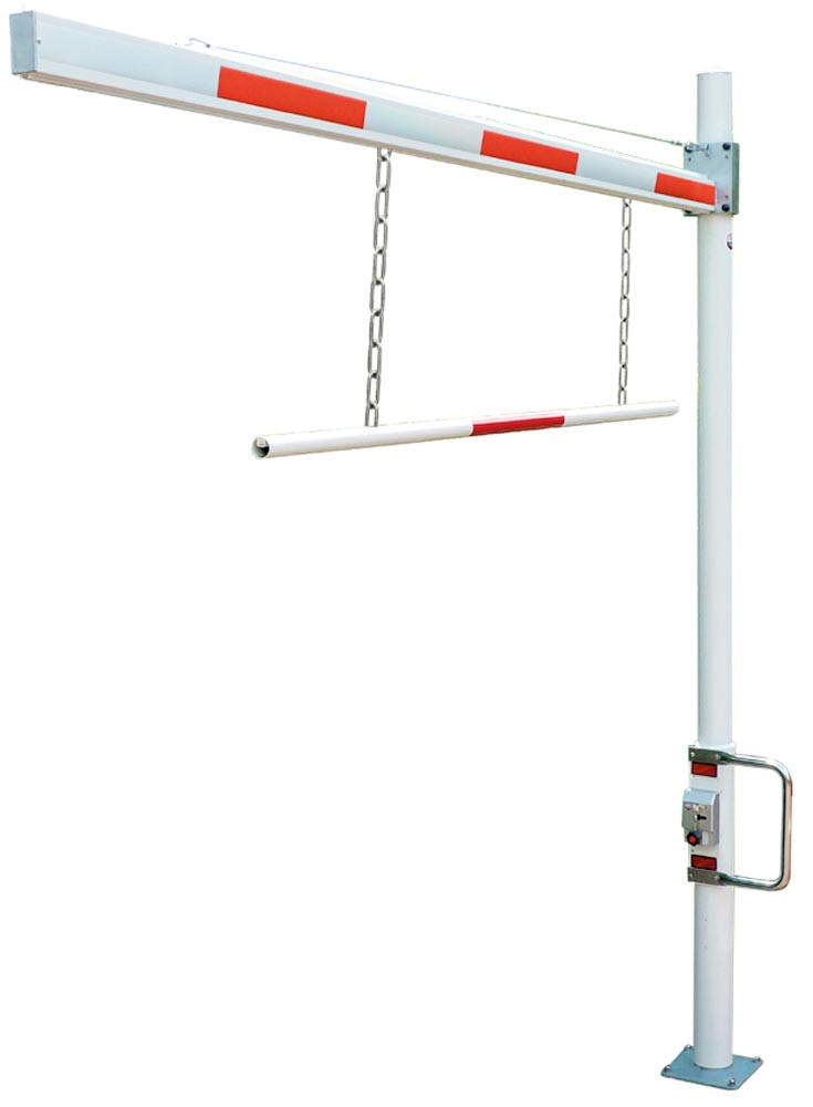 ∙ Mit verstellbarer Durchfahrthöhe bis zu 2,8 m über Flur ∙ Gesamthöhe 3,0 m über Flur ∙ Alle Stahlbauteile feuerverzinkt oder Edelstahl ∙ Drehpfosten aus Stahlrohr Ø 101,6 x 4 mm, oben abgesetzt auf 121 x 2,9 mm ∙ Einteiliger Alu-Sperrbalken 86 x 46 mm, mit Schilder- und Werbekulisse ∙ Seilzugverstärkung