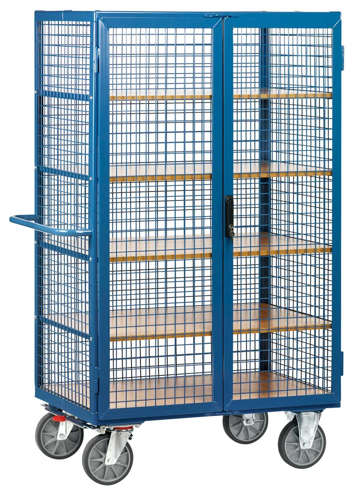 ∙ Schweißkonstruktion aus Winkelstahl ∙ Mit Rohrschiebegriff ∙ Doppelflügeltür, Stirnwände, Längswand und Dach mit Drahtgitter 40 x 40 x 4 mm eingeschweißt ∙ Tür mit Treibriegelverschluss und eingebautem Zylinderschloss ∙ RAL 5007 brillantblau pulverbeschichtet ∙ Schlag- und kratzfest ∙ 1 fester und 4 verstellbare Böden aus Holzwerkstoffplatte mit Buchendekor ∙∙ 2 Lenk- und 2 Bockrollen ∙ TPE-Bereifung ∙ Naben mit Präzisions-Rillenkugellager · Inkl. TOTALSTOP-Zentralbremssystem