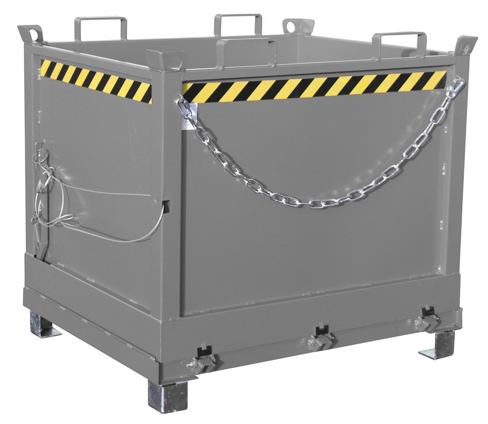 ∙ Entriegelung der Bodenklappe per Seilzug vom Stapler aus ∙ Bodenklappe schließt beim Aufsetzen selbsttätig, 90° Öffnungsbereich ∙ Sicherung für Bodenklappe gegen Abrutschen und ungewünschtes Öffnen ∙ Aufnahme für Gabelstapler und Kran sowie mit Gabelhubwagen transportierbar ∙ Robuste Stahlblechkonstruktion: Wandstärke 3 mm, Bodenklappenstärke 4 mm ∙ Einfahrbügel an der Oberseite des Behälters, Einfahrtaschen an der Unterseite · Unterfahrhöhe 100 mm