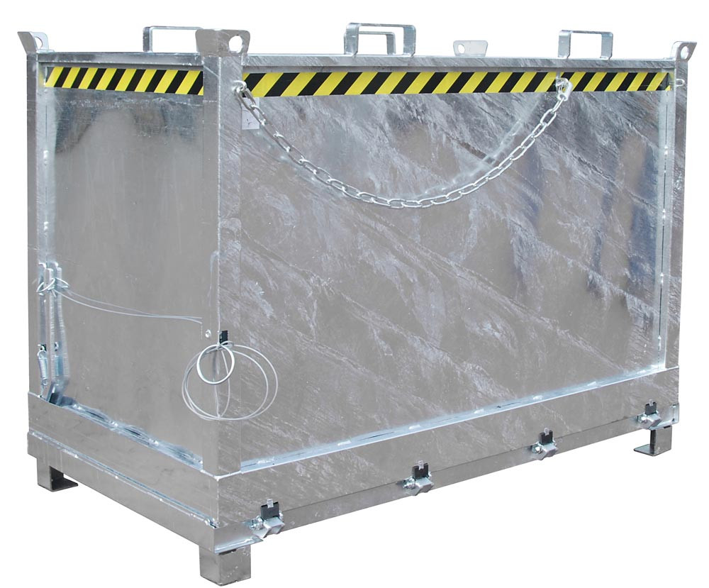 ∙ Entriegelung der Bodenklappe per Seilzug vom Stapler aus ∙ Bodenklappe schließt beim Aufsetzen selbsttätig, 90° Öffnungsbereich ∙ Sicherung für Bodenklappe gegen Abrutschen und ungewünschtes Öffnen ∙ Aufnahme für Gabelstapler und Kran sowie mit Gabelhubwagen transportierbar ∙ Robuste Stahlblechkonstruktion: Wandstärke 3 mm, Bodenklappenstärke 4 mm ∙ Einfahrbügel an der Oberseite des Behälters, Einfahrtaschen an der Unterseite · Unterfahrhöhe 100 mm