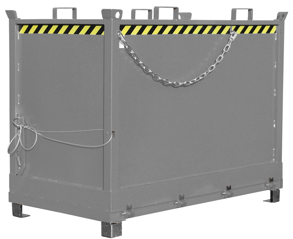 ∙ Entriegelung der Bodenklappe per Seilzug vom Stapler aus ∙ Bodenklappe schließt beim Aufsetzen selbsttätig, 90° Öffnungsbereich ∙ Sicherung für Bodenklappe gegen Abrutschen und ungewünschtes Öffnen ∙ Aufnahme für Gabelstapler und Kran sowie mit Gabelhubwagen transportierbar ∙ Robuste Stahlblechkonstruktion: Wandstärke 3 mm, Bodenklappenstärke 4 mm ∙ Einfahrbügel an der Oberseite des Behälters, Einfahrtaschen an der Unterseite · Unterfahrhöhe 100 mm