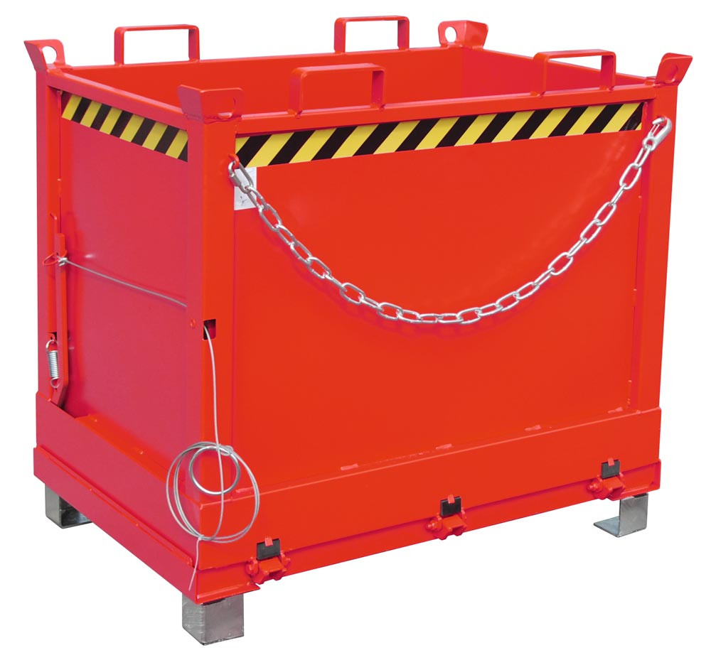 ∙ Entriegelung der Bodenklappe per Seilzug vom Stapler aus ∙ Bodenklappe schließt beim Aufsetzen selbsttätig, 90° Öffnungsbereich ∙ Sicherung für Bodenklappe gegen Abrutschen und ungewünschtes Öffnen ∙ Aufnahme für Gabelstapler und Kran sowie mit Gabelhubwagen transportierbar ∙ Robuste Stahlblechkonstruktion: Wandstärke 3 mm, Bodenklappenstärke 4 mm ∙ Einfahrbügel an der Oberseite des Behälters, Einfahrtaschen an der Unterseite · Unterfahrhöhe 100 mm