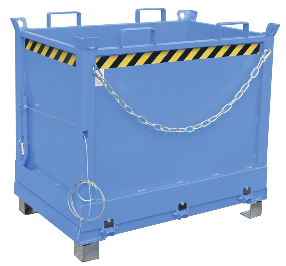 ∙ Entriegelung der Bodenklappe per Seilzug vom Stapler aus ∙ Bodenklappe schließt beim Aufsetzen selbsttätig, 90° Öffnungsbereich ∙ Sicherung für Bodenklappe gegen Abrutschen und ungewünschtes Öffnen ∙ Aufnahme für Gabelstapler und Kran sowie mit Gabelhubwagen transportierbar ∙ Robuste Stahlblechkonstruktion: Wandstärke 3 mm, Bodenklappenstärke 4 mm ∙ Einfahrbügel an der Oberseite des Behälters, Einfahrtaschen an der Unterseite · Unterfahrhöhe 100 mm