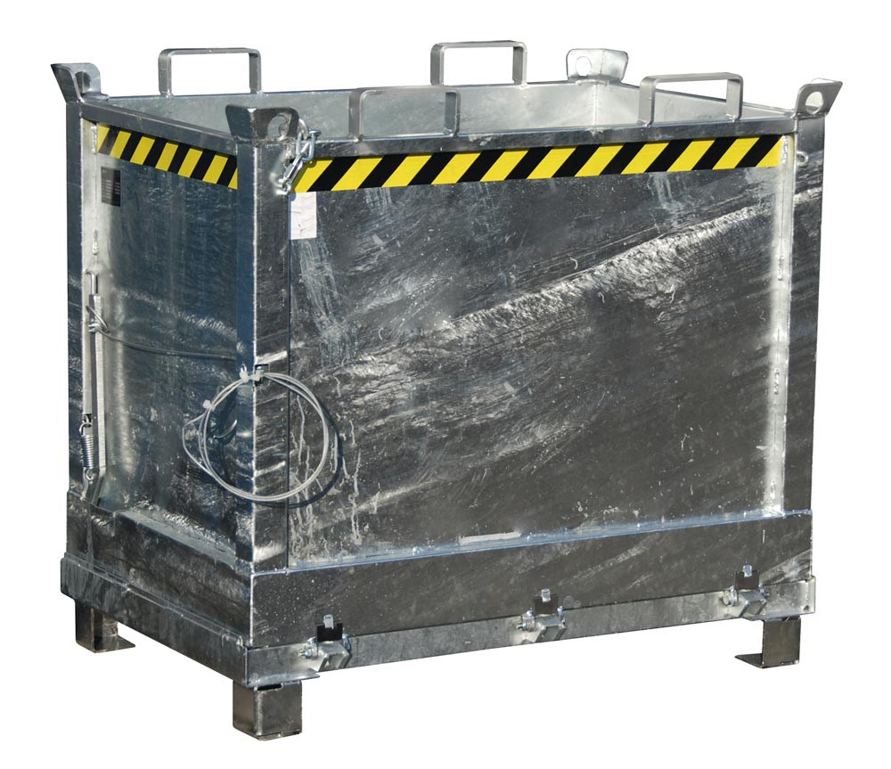 ∙ Entriegelung der Bodenklappe per Seilzug vom Stapler aus ∙ Bodenklappe schließt beim Aufsetzen selbsttätig, 90° Öffnungsbereich ∙ Sicherung für Bodenklappe gegen Abrutschen und ungewünschtes Öffnen ∙ Aufnahme für Gabelstapler und Kran sowie mit Gabelhubwagen transportierbar ∙ Robuste Stahlblechkonstruktion: Wandstärke 3 mm, Bodenklappenstärke 4 mm ∙ Einfahrbügel an der Oberseite des Behälters, Einfahrtaschen an der Unterseite · Unterfahrhöhe 100 mm