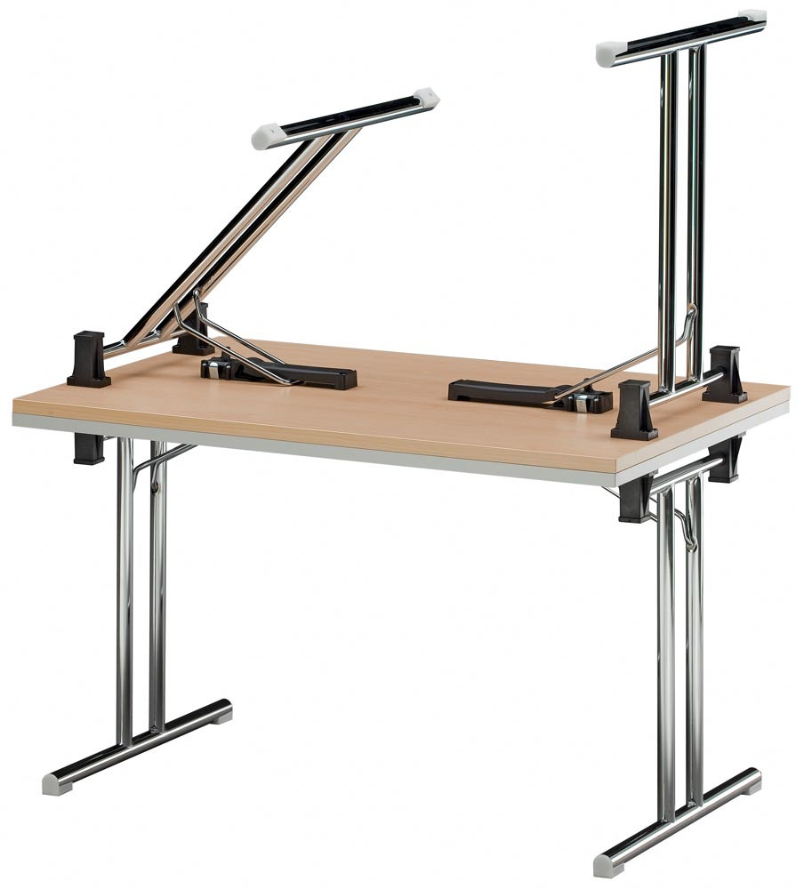 ∙ Klapptische mit 25 mm starker, melaminharzbeschichteter Gütespanplatte ∙ 2 mm ABS-Kante passend zum Dekor ∙ Tischgestell verchromt ∙ Kunststoffdistanzhalter für Stapelung ∙ Kunststoffbodengleiter in schwarz