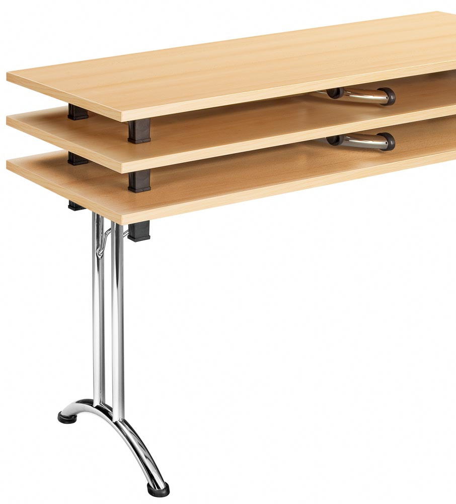 ∙ Klapptische mit 25 mm starker, melaminharzbeschichteter Gütespanplatte ∙ 2 mm ABS-Kante passend zum Dekor ∙ Tischgestell verchromt ∙ Kunststoffdistanzhalter für Stapelung ∙ Kunststoffbodengleiter in schwarz