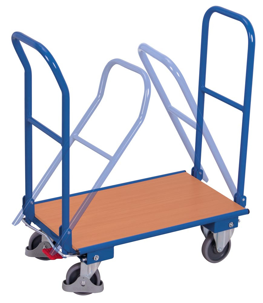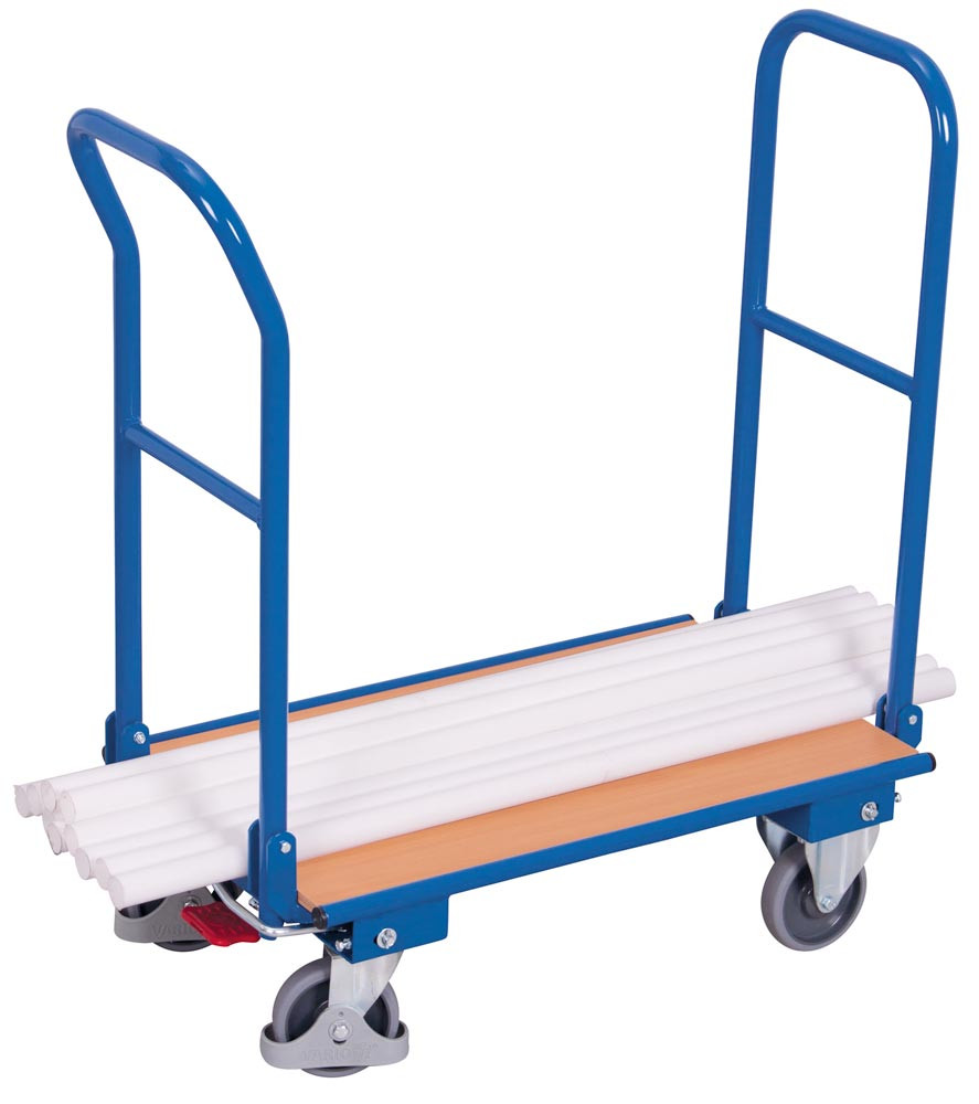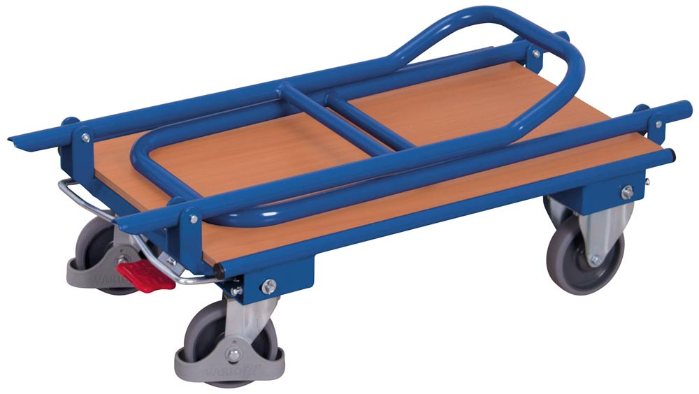 ∙ Schweißkonstruktion aus Stahlrohr ∙ RAL 5010 enzianblau pulverbeschichtet ∙ Schlag- und kratzfest · Schiebebügel klappbar ∙ Ladefläche Holzwerkstoffplatte mit Buchendekor ∙ 2 Lenk- und 2 Bockrollen · Lenkrollen gemäß EN 1757-3 mit zentraler Fußbremse EasySTOP und Fußschutz · Thermoplastische Vollgummi-Bereifung, grau "spurlos" · Naben mit Präzisions-Rillenkugellager und Fadenschutz