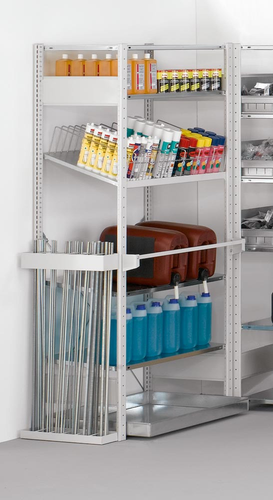 Kleinteile-Regalmodul 1, Anbaufeld, BxTxH 1000x500x2000 mm, 4 Böden, 1 Gew.st.halt., 1 Schrägb., 12 Trennbügel, 1 Verr.stange Öllager, 1 Auffangw. E876919