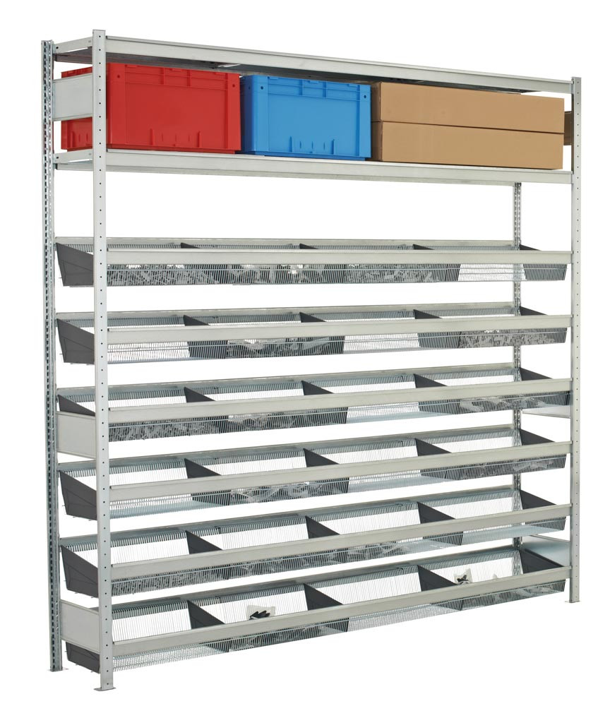 · Zur übersichtlichen Lagerung von losen Kleinteilen mit unterschiedlichsten Einsatzmöglichkeiten · Ideal einsetzbar für Lager- und Verkaufsräume · Individuelle Höheneinstellung der Lagerebenen durch 25 mm-Raster · Flexible Unterteilung der Gitterkörbe durch Fachteiler möglich · Gitterwannen werden in die Holme eingehangen · 6 Gitterkorbebenen mit je 5 Fachteiltern, Maschenweite 10 mm, Höhe vorne 120 mm, Höhe hinten 170 mm