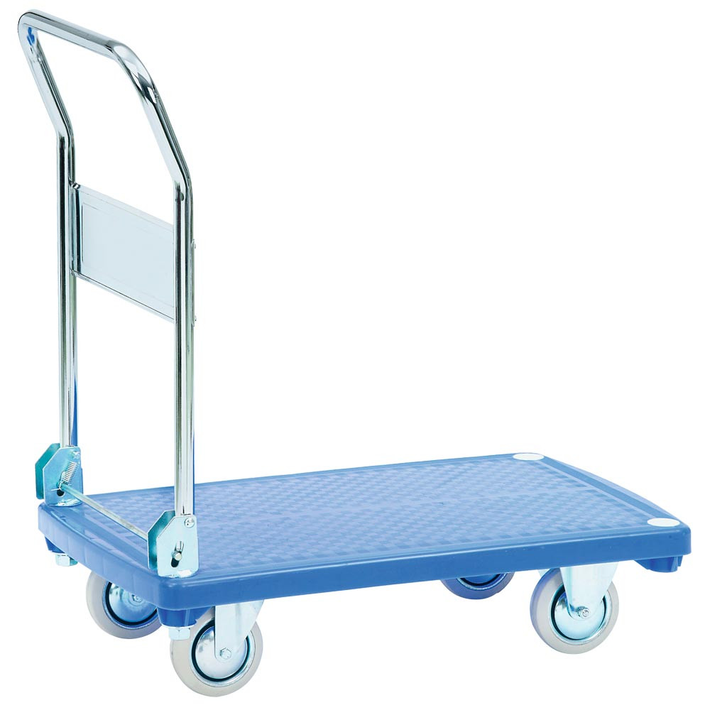 ∙ Ladefläche aus Kunststoff gespritzt ∙ Mit rutschhemmender Oberfläche ∙ Farbe blau ∙ Klappbarer Rohrschiebebügel ∙ 2 Lenk- und 2 Bockrollen ∙ Vollgummi-Bereifung blaugrau ∙ Naben mit Gleitlagerung