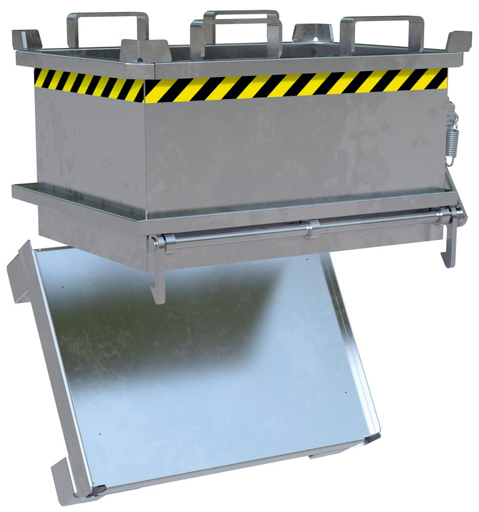 · Ideal überall dort einsetzbar, wo wenig Platz ist · Robuste Stahlkonstruktion mit glatten Innenwänden · Entriegelung der Bodenklappe per Seilzug vom Staplersitz · Bodenklappe schließt beim Aufsetzen selbsttätig · Sicherung gegen unbeabsichtigtes Abrutschen und Öffnen der Bodenklappe · Durch 100 mm Unterfahrhöhe mit Gabelhubwagen transportierbar · 3-fach stapelbar