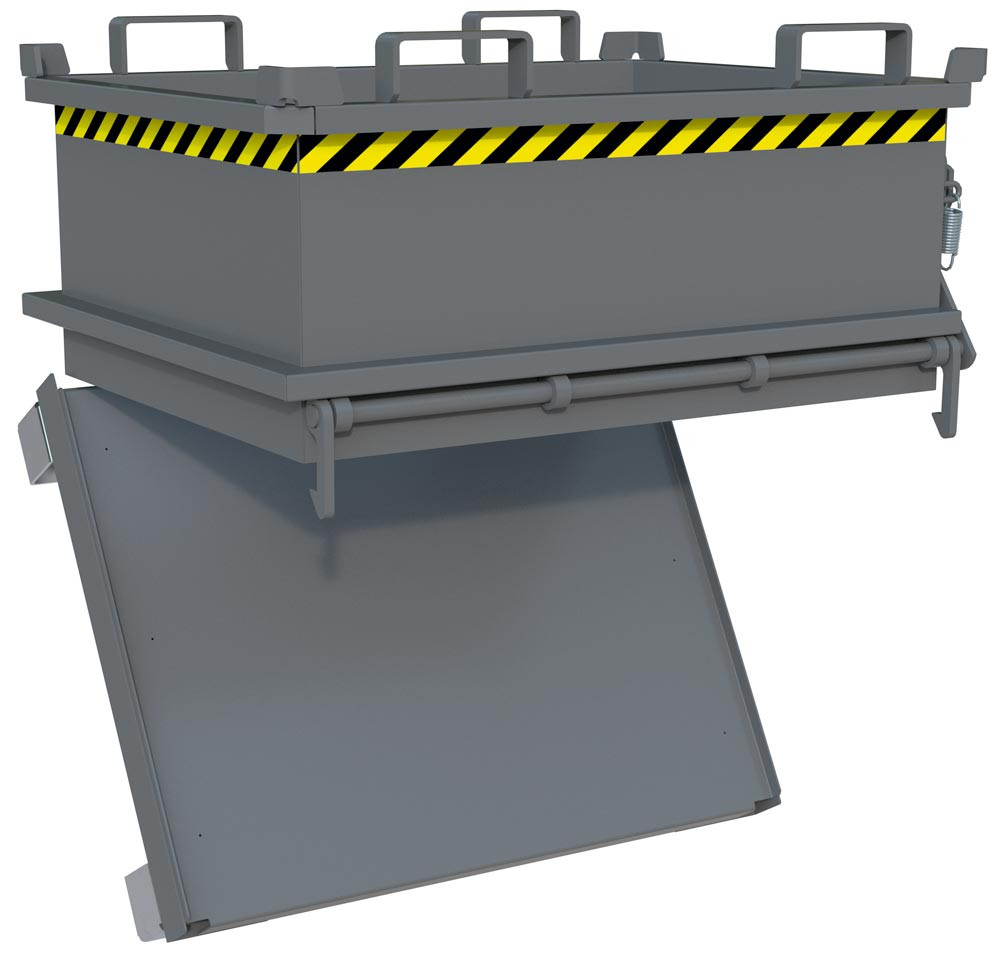 · Ideal überall dort einsetzbar, wo wenig Platz ist · Robuste Stahlkonstruktion mit glatten Innenwänden · Entriegelung der Bodenklappe per Seilzug vom Staplersitz · Bodenklappe schließt beim Aufsetzen selbsttätig · Sicherung gegen unbeabsichtigtes Abrutschen und Öffnen der Bodenklappe · Durch 100 mm Unterfahrhöhe mit Gabelhubwagen transportierbar · 3-fach stapelbar