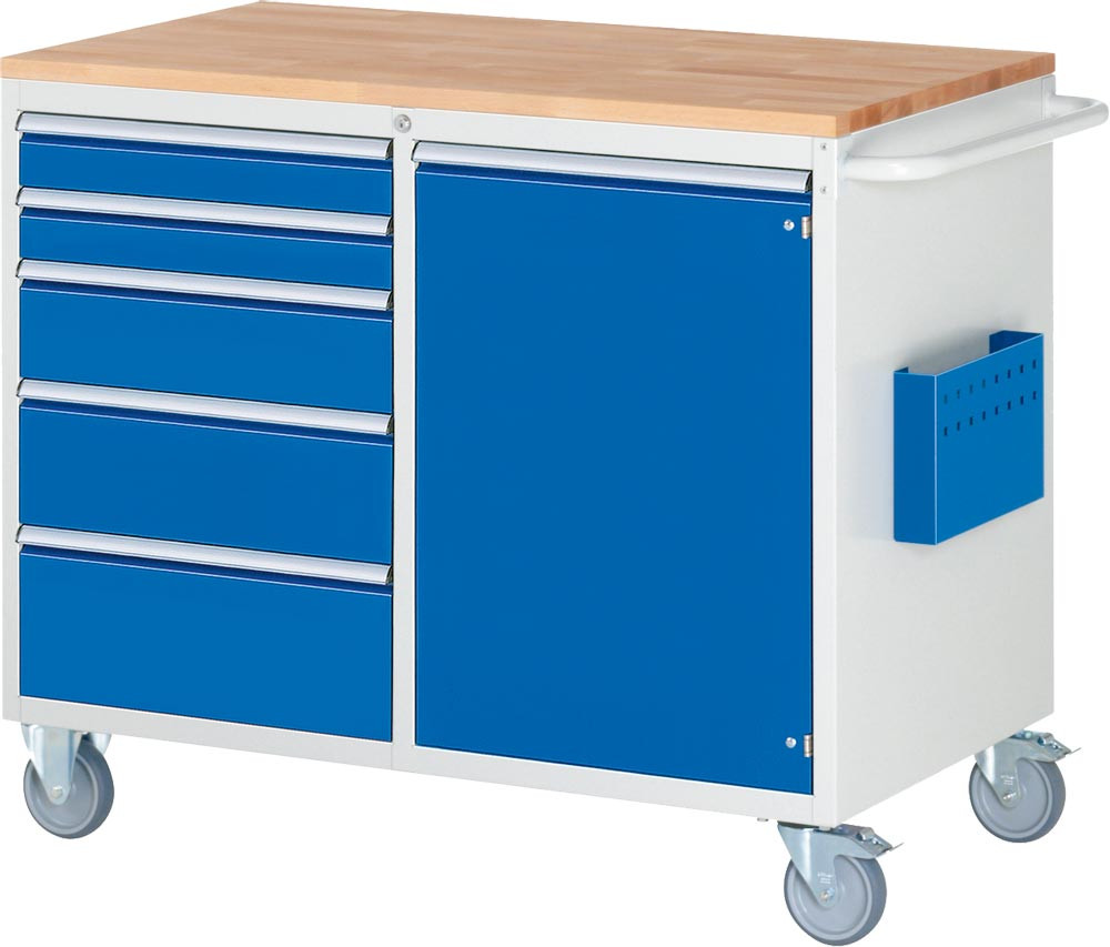Montagewagen mit Buche Platte 25mm, BxTxH 1145x650x975 mm, 5 Schubladen: 2x90/1x150/1x180/1x210 mm, 1 Tür 720 mm, 1 Fachboden, RAL 7035/5010