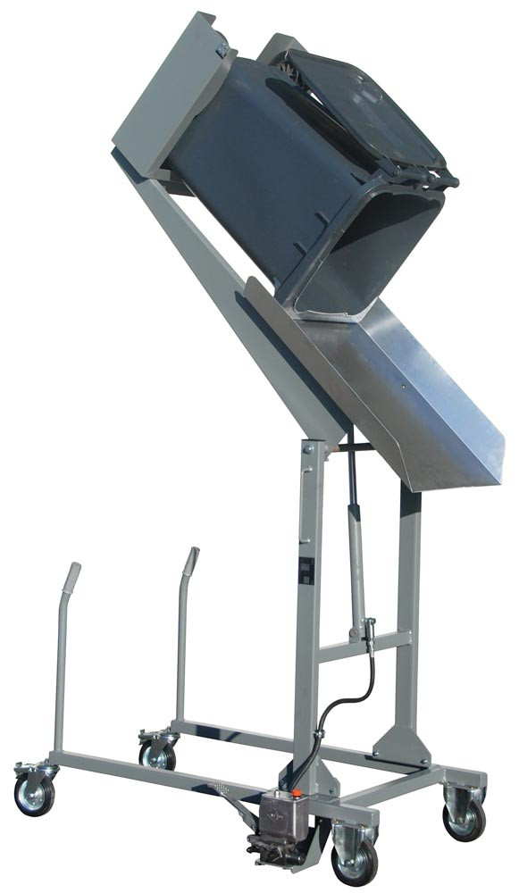 · Zur Entleerung und Reinigung von 120- und 240 Liter Mülltonnen · Kippwinkel bis 135° · Ausschütthöhe ca. 1480 mm · 2 Lenk- und 2 Bockrollen aus Vollgummi, Ø 180 mm, Lenkrollen mit Feststeller, Bauhöhe 225 mm · Traglast 110 kg