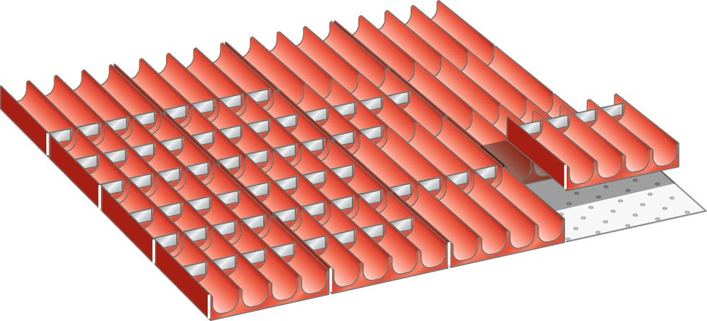 Mulden, Fronthöhe 50 mm, 16 Mulden 4-teilig, 70 Muldenwände 4-teilig, Schubladennutzgröße BxT 612x612 mm