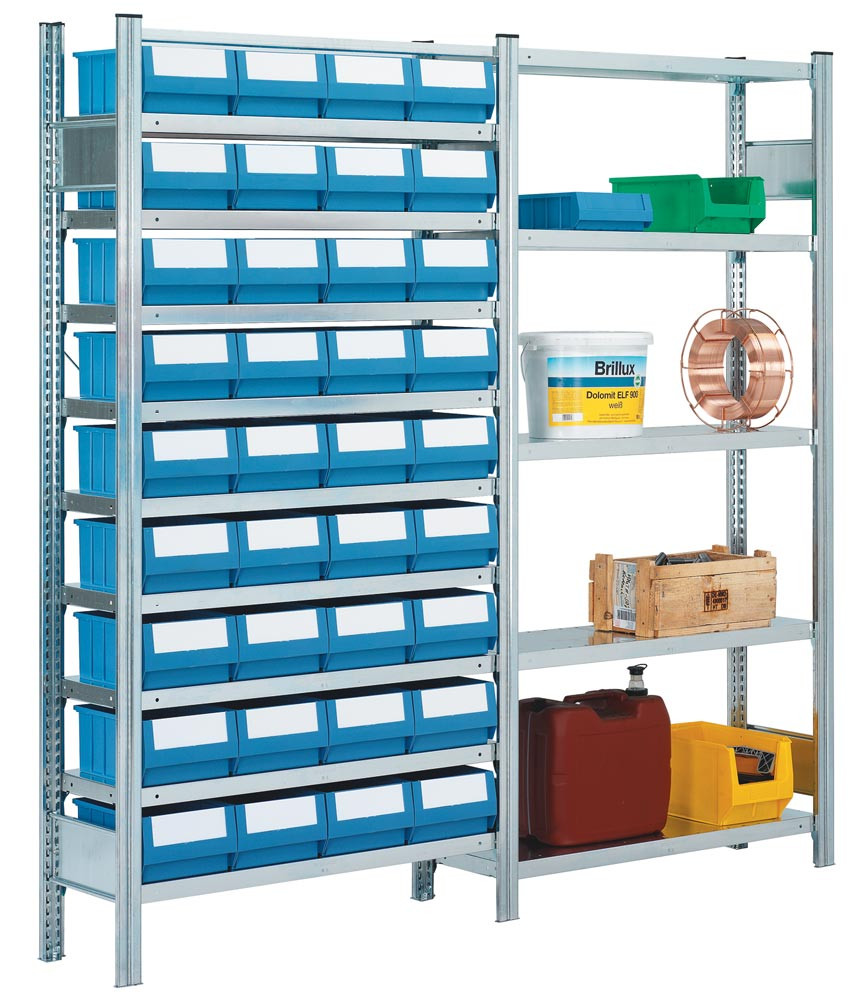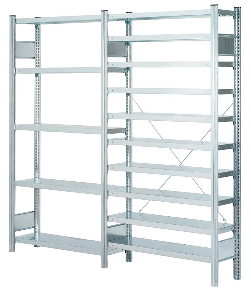 ∙ Ohne Werkzeug, ohne Schrauben - im Handumdrehen aufgestellt ∙ Grund- und Anbaufelder ∙ Voll verzinkt ∙ Fachböden allseitig mit 40 mm Abkantung, Rohrverstärkung in Längsrichtung ∙ Fachlast 140 kg, Feldlast max. 1400 kg (bei gleichmäßg verteilter Last) ∙ Regalaussteifung durch Kreuzdiagonalen in jedem zweiten Regalfeld ∙ Breitenriegel als oberer Abschluss statt Fachboden, fest montiert ∙ Auf Anfrage: Hintere Fachbodenanschläge