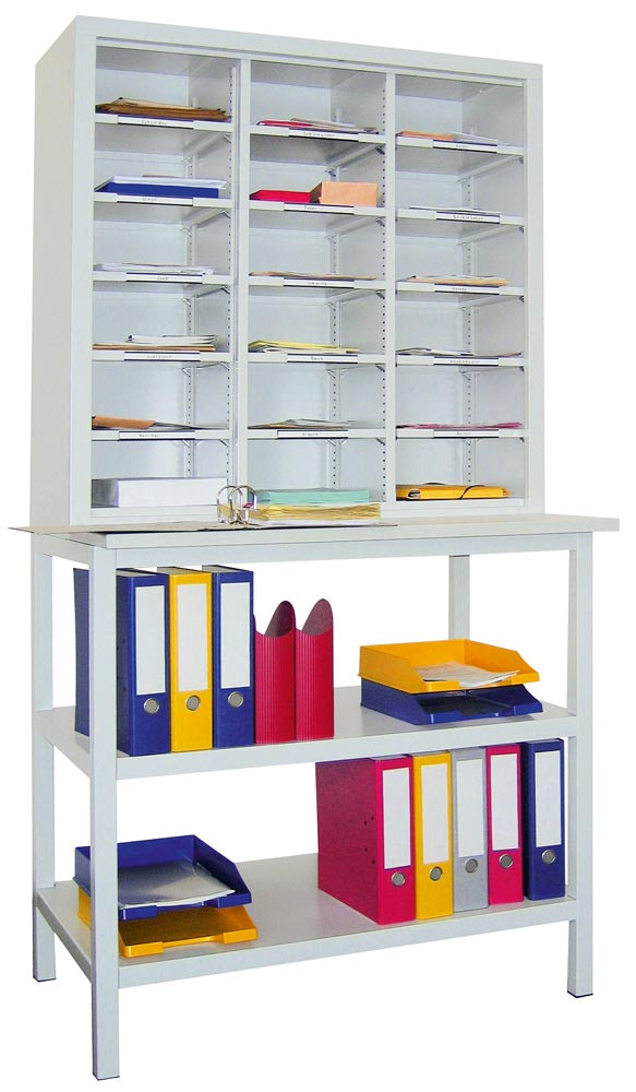 Ordnungsregal, BxTxH 1000x700x1950 mm, 3x6 Fächer, Regaltiefe 400 mm, Ablagetisch HxT 950x600 mm mit 2 Böden, RAL 7035 lichtgrau