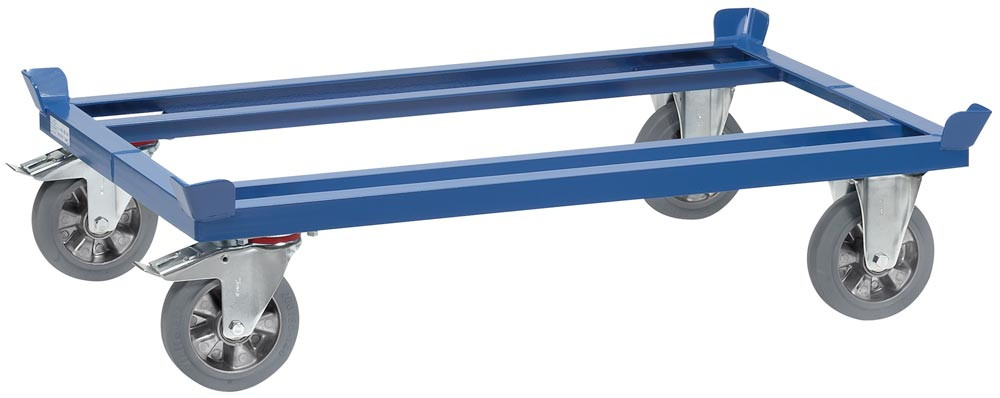 · Für Flachpaletten und Gitterboxen geeignet ∙ Sauber verschweißte Winkelstahl-Konstruktion · Mit 4 Fangecken ∙ Schlag- und kratzfest ∙ 2 Lenk- und 2 Bockrollen ∙ Lenkrollen gemäß EN 1757-3 mit Rad-Feststeller · Blaugraue Vollgummi-Elastic-Bereifung, Rad-Ø 200 mm, Naben mit Kugellager ∙ Durch optionales Zubehör erweiterbar